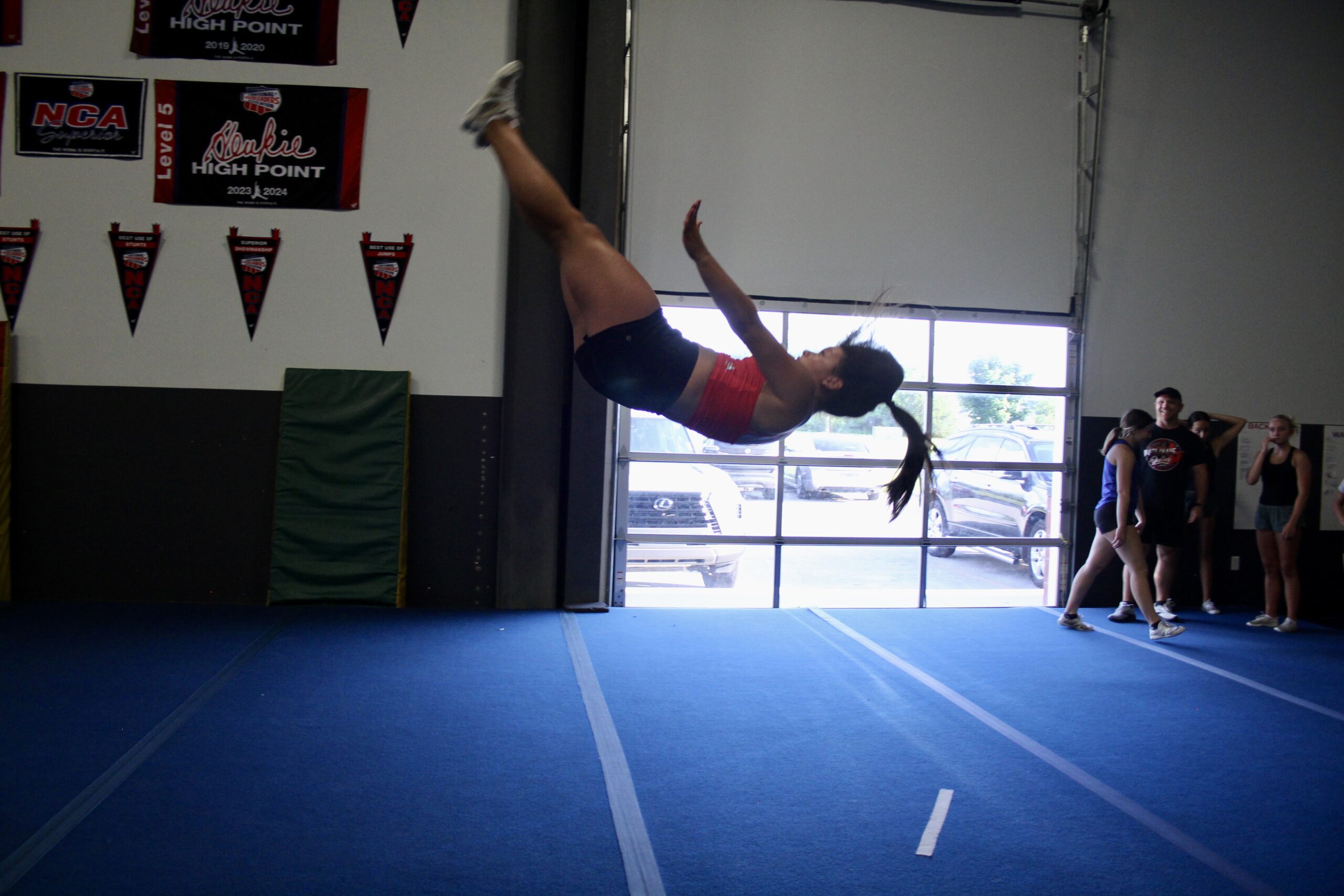 The Layouts & Standing Tucks class challenges athletes to refine advanced tumbling with precision and consistency. Athletes work on developing hollow-body layouts in running passes while also mastering the strength and explosiveness required for standing tucks.